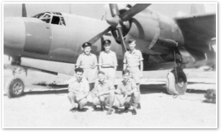 Our first trophy was a large three-engined Savoia Marchetti 82 Kangaroo transport. Shortly after that we shot down a four-engined Junkers 90. But one late evening with the setting sun, as we sped low over the sea, we became the hunted. We were attacked by 2 Me109 fighters at sea-level. After a short gun battle, my tail gunner, Gil Graham, managed to hit one of them and severely damage it. It departed in a plume of white smoke from a glycol leak. Now there was only one. Then disaster - the electrical power to the top gun turret fused! We were now virtually defenceless. As the second Me109 pressed home his attack, I kept the Marauder flying into the sun, moving this way and that, never on the same course for more than three seconds. The tail gunner reported on three occasions that the sea was churned up with a "whoosh" of cannon fire, exactly where we had been just a second before. Eventually, the second Me109 ran out of ammunition and left us to make our escape.